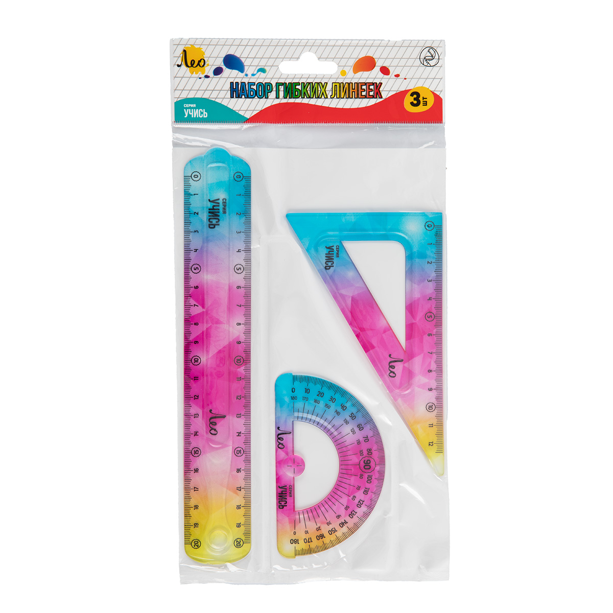 "Лео" LSRFSR-20 Набор гибких линеек 3 предмета (линейка 20 см, угольник 30/60 гр.14 см, транспортир 11 см) градиент 24 шт. в пакете с еврослотом 05 градиент