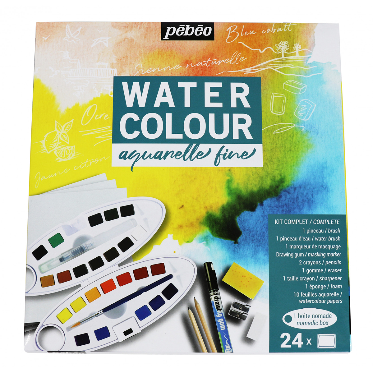 Набор акварельных красок Pebeo - состоит из 24 маленьких кювет тонкой акварели + аксессуары в овальной упаковке. Содержит необходимый набор красок, инструментов и аксессуаров для акварелиста.