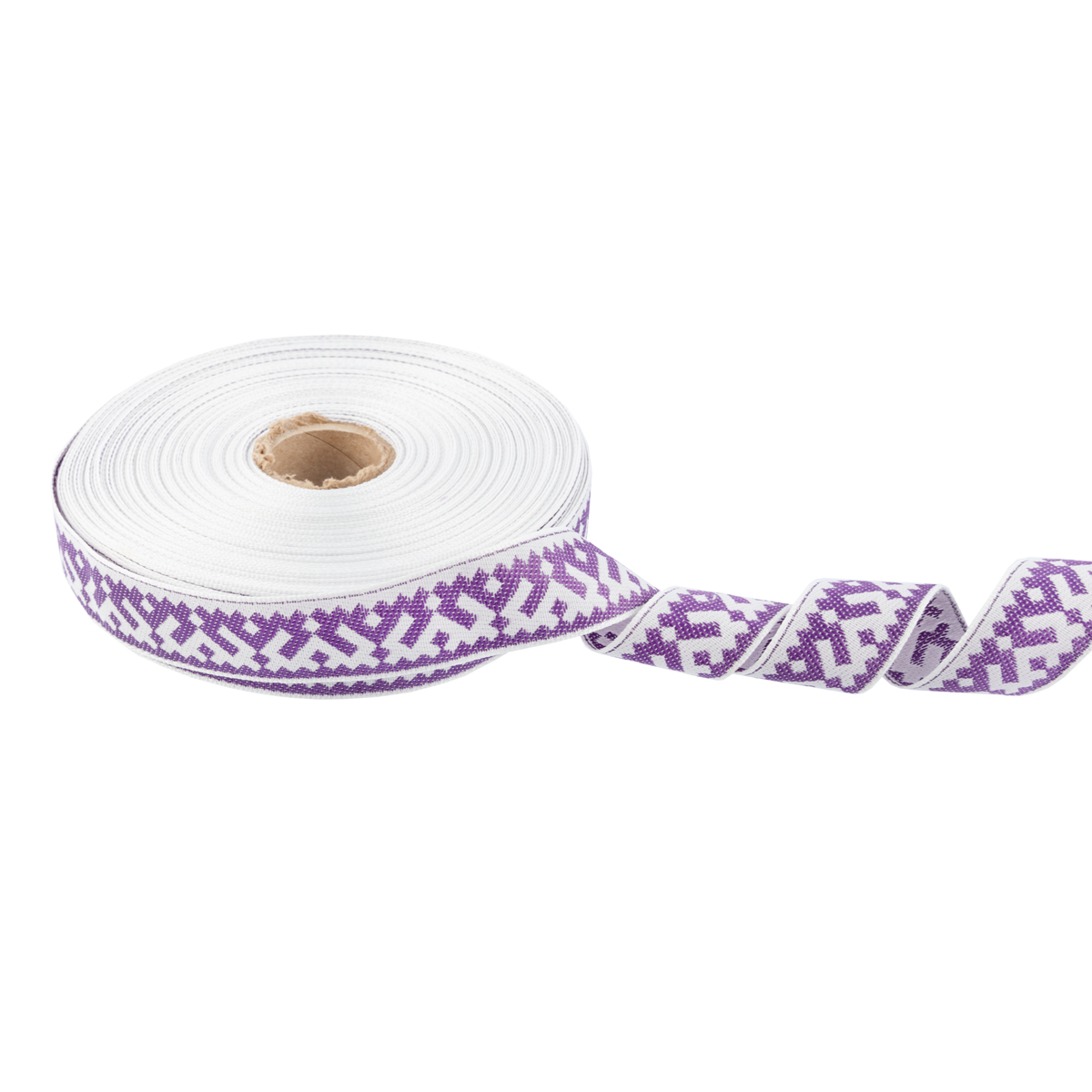 Лента жаккардовая 24 мм "Gamma" С3772 25 м Лента отделочная "Орнамент для северных народов" рис 9674 белый/фиолетовый