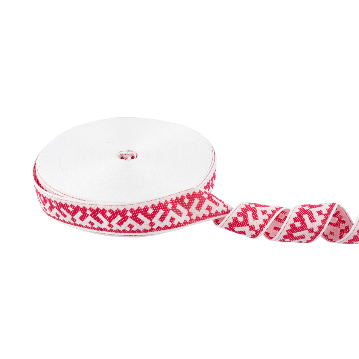 Лента жаккардовая 24 мм "Gamma" С3772 25 м Лента отделочная "Орнамент для северных народов" рис 9674 белый/малиновый