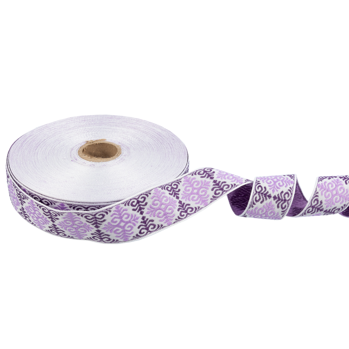 Лента жаккардовая 32 мм "Gamma" С3774 25 м отделочная "Орнамент для северных народов" рис 9788 белый-фиолетовый-сиреневый