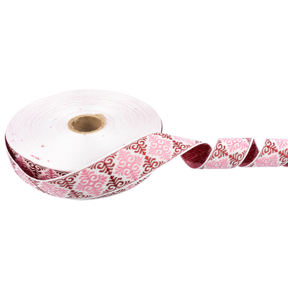 Лента жаккардовая 32 мм "Gamma" С3774 25 м отделочная "Орнамент для северных народов" рис 9788 белый-бордовый-розовый