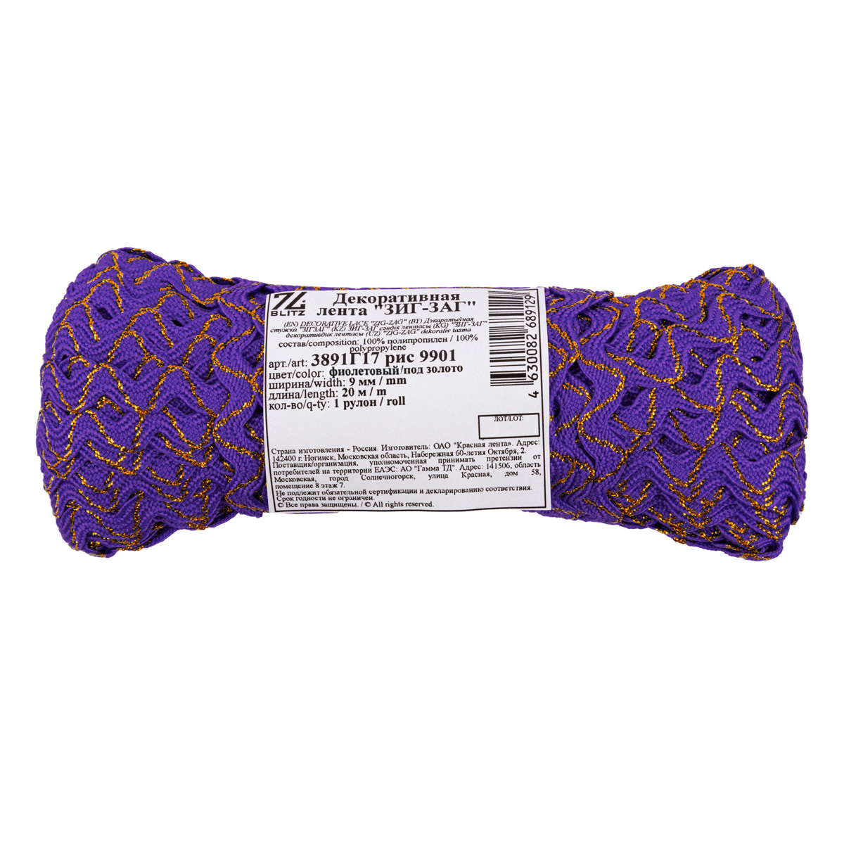 "BLITZ" 3891Г17 рис 9901 лента декоративная "ЗИГ-ЗАГ" 9 мм 20 м фиолетовый/под золото