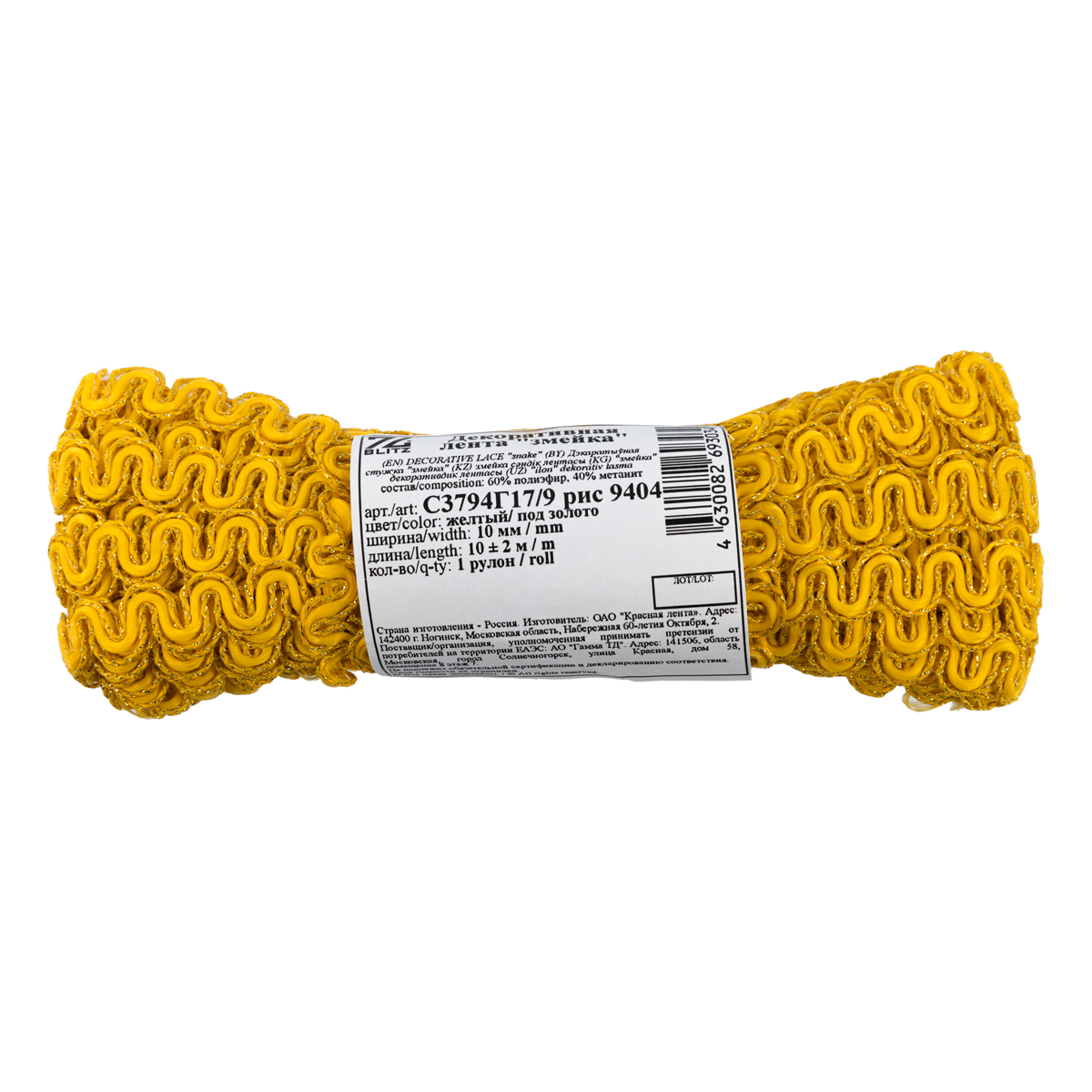 "BLITZ" С3794Г17/9 рис 9404 лента декоративная "ЗМЕЙКА" метал. рис. 8657 10 мм 10 м желтый/ под золото