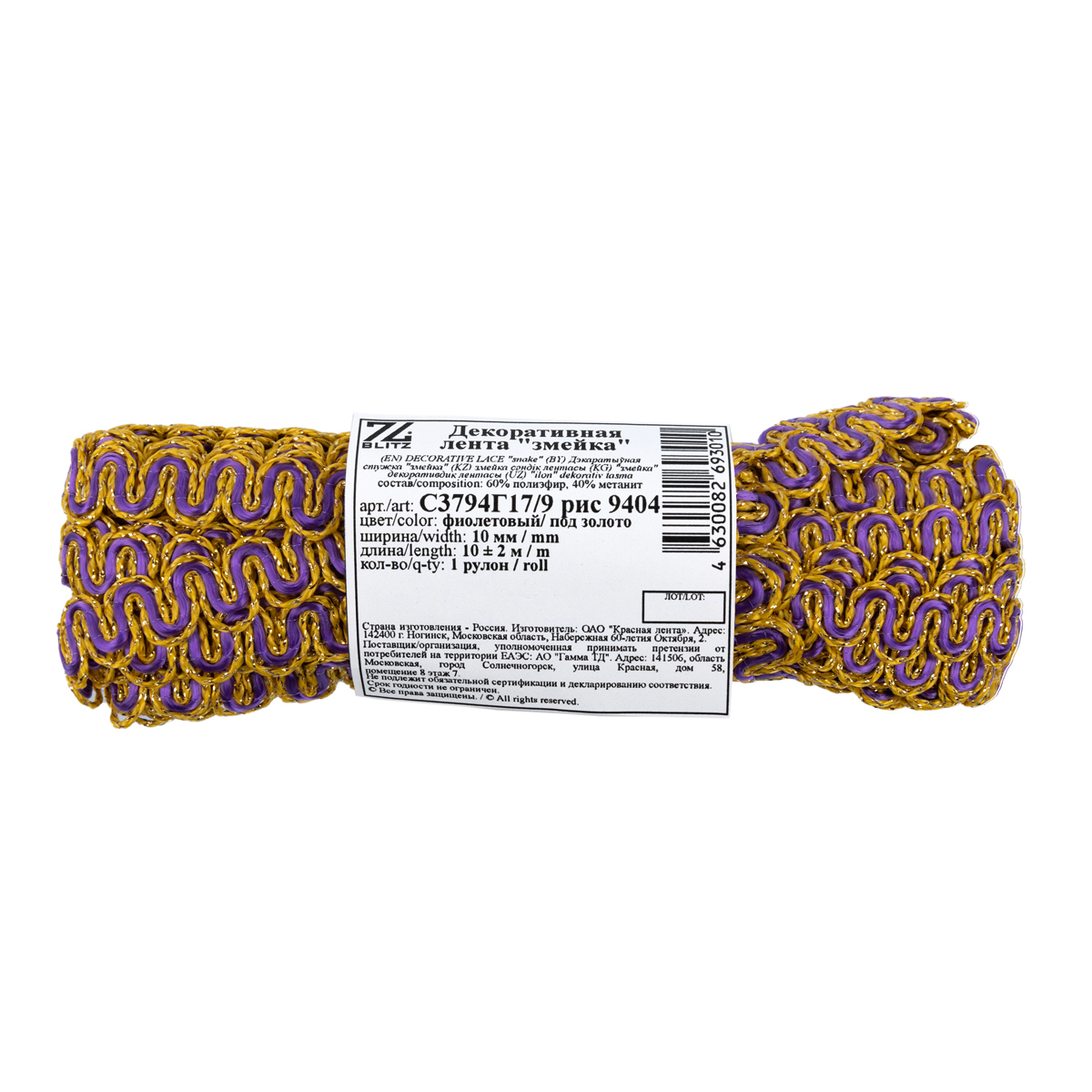 "BLITZ" С3794Г17/9 рис 9404 лента декоративная "ЗМЕЙКА" метал. рис. 8657 10 мм 10 м фиолетовый/ под золото