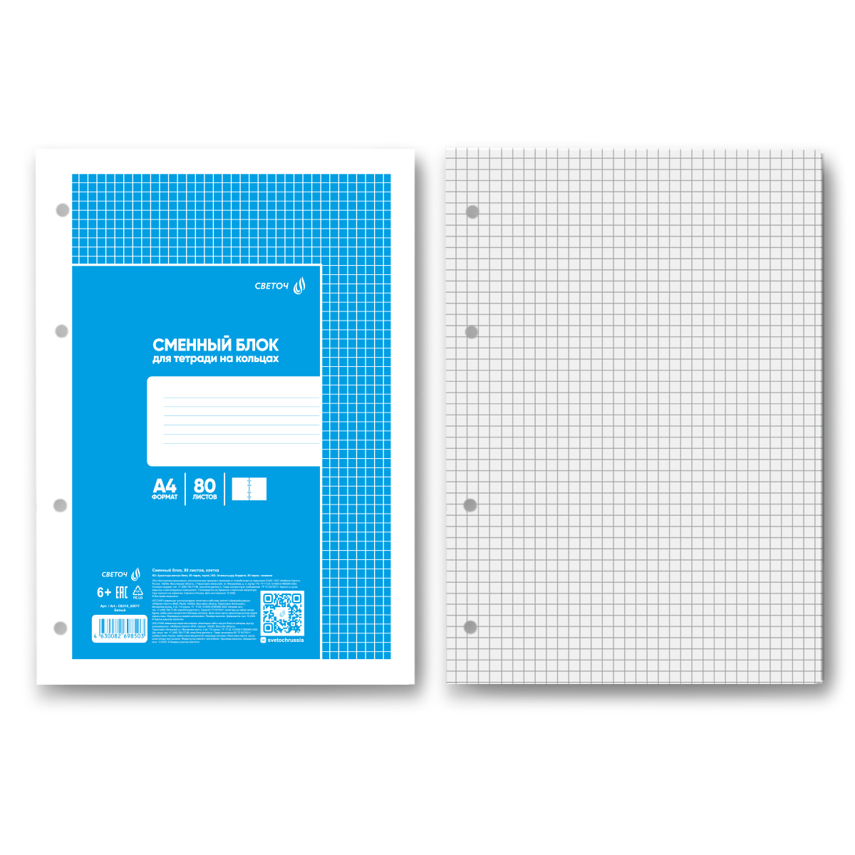 "Светоч" СБ315 Сменный блок для тетрадей на кольцах, A4 80 л. 65 г/кв.м , белизна 100 % 20 шт. клетка 02017 Белый, черная клетка
